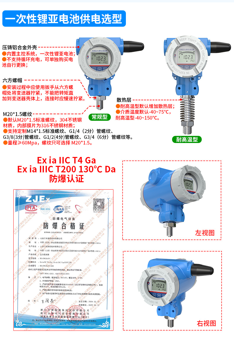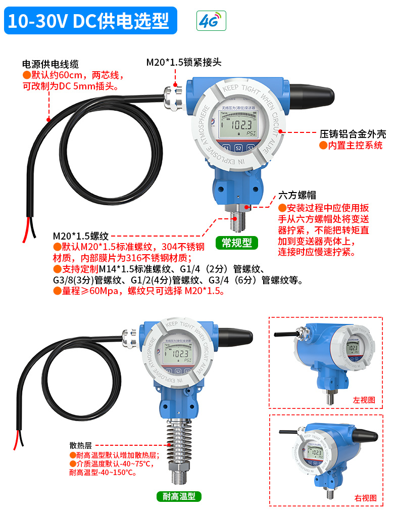 基于4G/NB-loT無線通信的無線壓力變送器由“壓鑄鋁合金外殼、主控系統(tǒng)、液晶顯示屏、測量電路、機(jī)械連接件、擴(kuò)散硅敏感元件”等核心部件組成,支持多種規(guī)格螺紋安裝方式,可適配多種壓力量程,支持150C高溫介質(zhì)測量。默認(rèn)測量“氣體、液體、蒸汽”等介質(zhì)的相對(duì)壓力(表壓),依據(jù)項(xiàng)目實(shí)際需要改制測量介質(zhì)的絕對(duì)壓力(表壓+大氣壓力)以及負(fù)壓。