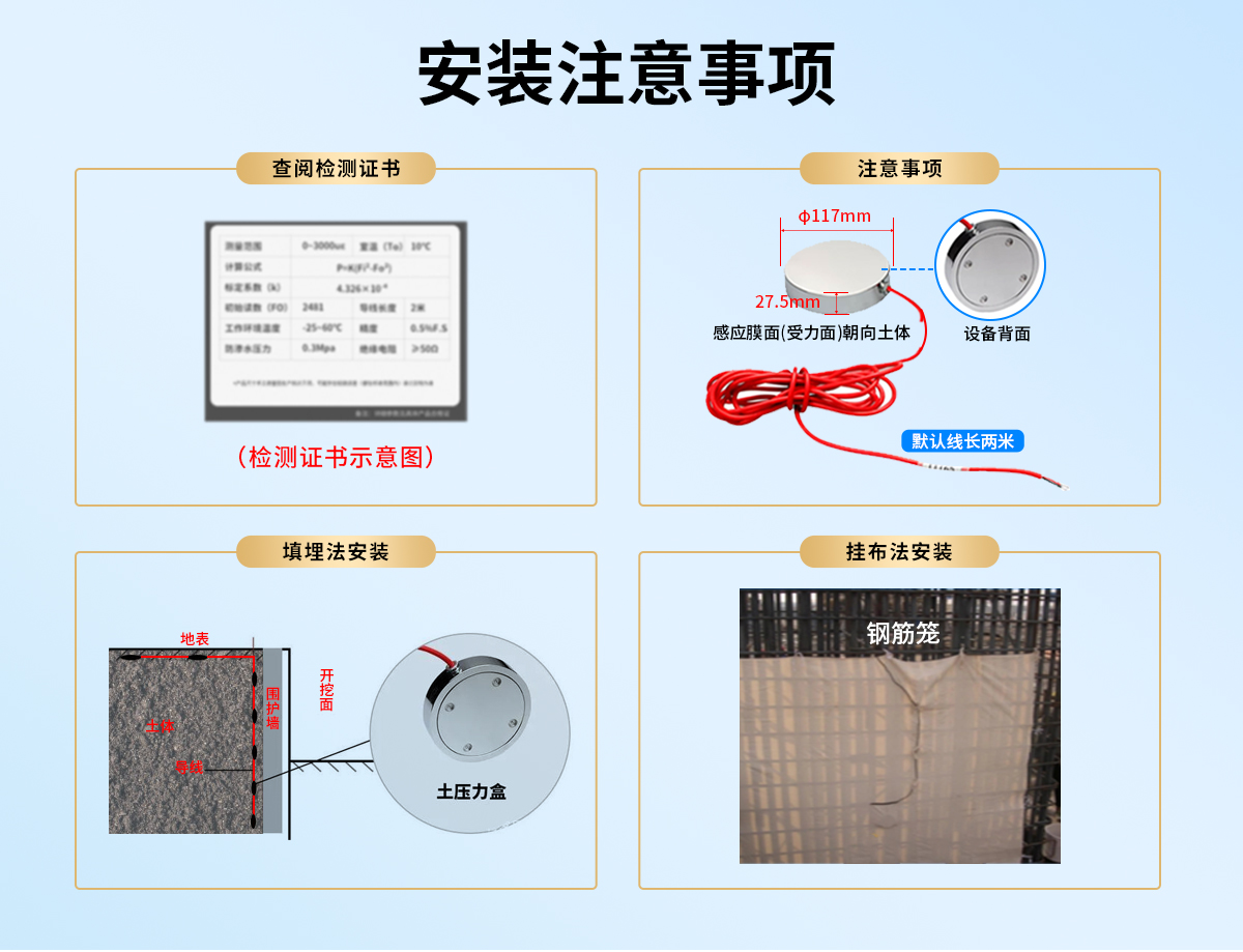 振弦式土壓力計(又稱土壓力盒)主要應(yīng)用檢測地下工程的施工如基坑或隧道開挖、盾構(gòu)掘進、打樁等引起周圍地層巖土壓力變化的監(jiān)測。地下結(jié)構(gòu)承受的壓力是直接作用在支護體系上的荷載,是支護結(jié)構(gòu)的設(shè)計依據(jù)。施工期間對巖土壓力進行監(jiān)測,對于確保地 下工程的安全至關(guān)重要。巖土壓力采用埋設(shè)土壓力計的方式進行監(jiān)測,若加裝溫度傳感器,即可同步測量安裝點的溫度。
