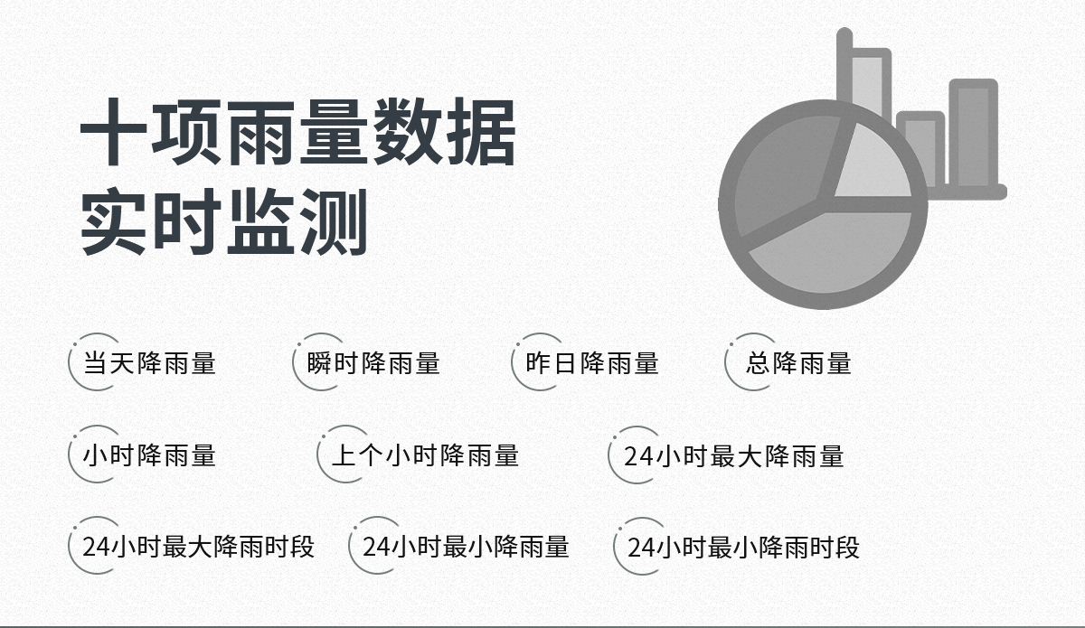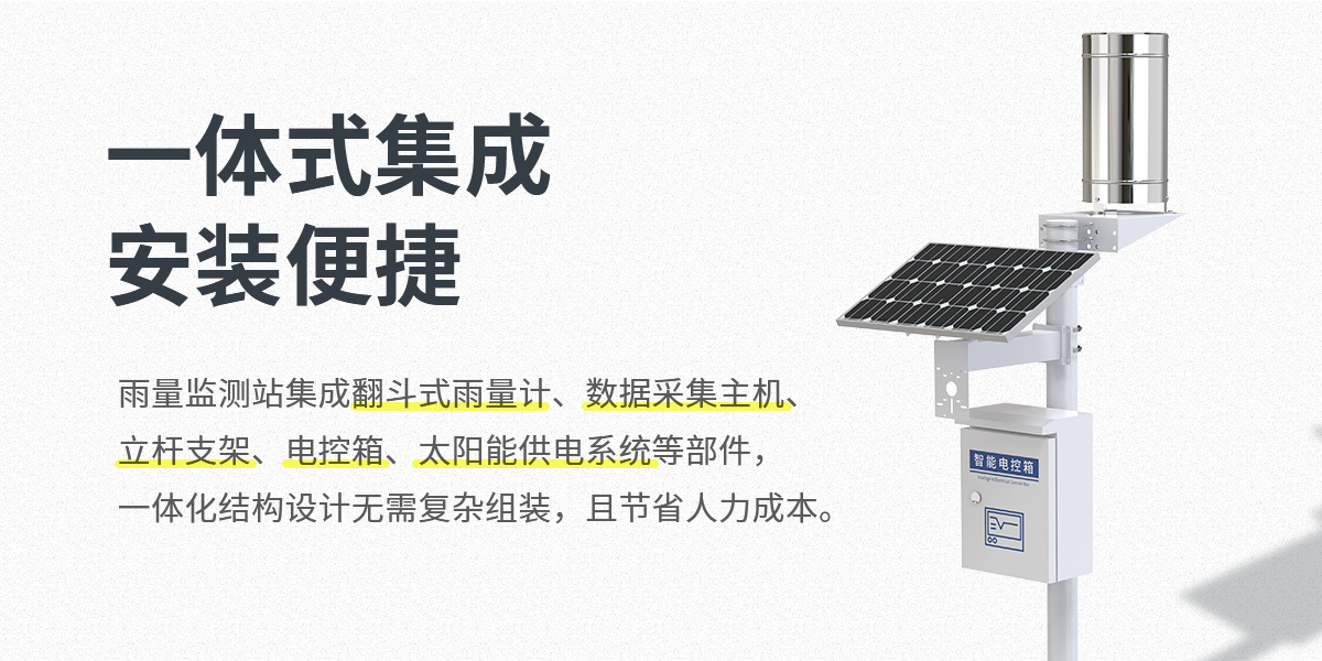 一體式雨量監(jiān)測站集成翻斗式雨量計、數(shù)據(jù)采集主機、立桿支架、電控箱、太陽能供電系統(tǒng)等部件,可監(jiān)測當(dāng)天降雨量、瞬時降雨量、昨日降雨量、總降雨量、小時降雨量、上個小時降雨量、24小時最大降雨量、24小時最大降雨時段、24小時最小降雨量、24小時最小降雨時段等十項雨量數(shù)據(jù)。提供免費云平臺,支持二次開發(fā)。