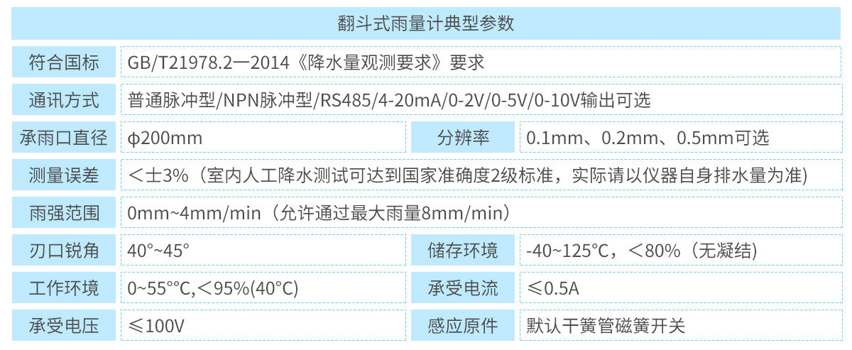 翻斗式雨量計完全符合GB/T21978.2一2014《降水量觀測要求》國標要求,可附帶水利部水文儀器及巖土工程儀器質(zhì)量監(jiān)督檢驗測試中心的檢測報告??刹杉矔r雨量、當天雨量、昨日雨量、累計雨量等十項雨量數(shù)據(jù),支持多種信號輸出方式,全系列產(chǎn)品均支持個性化定制。