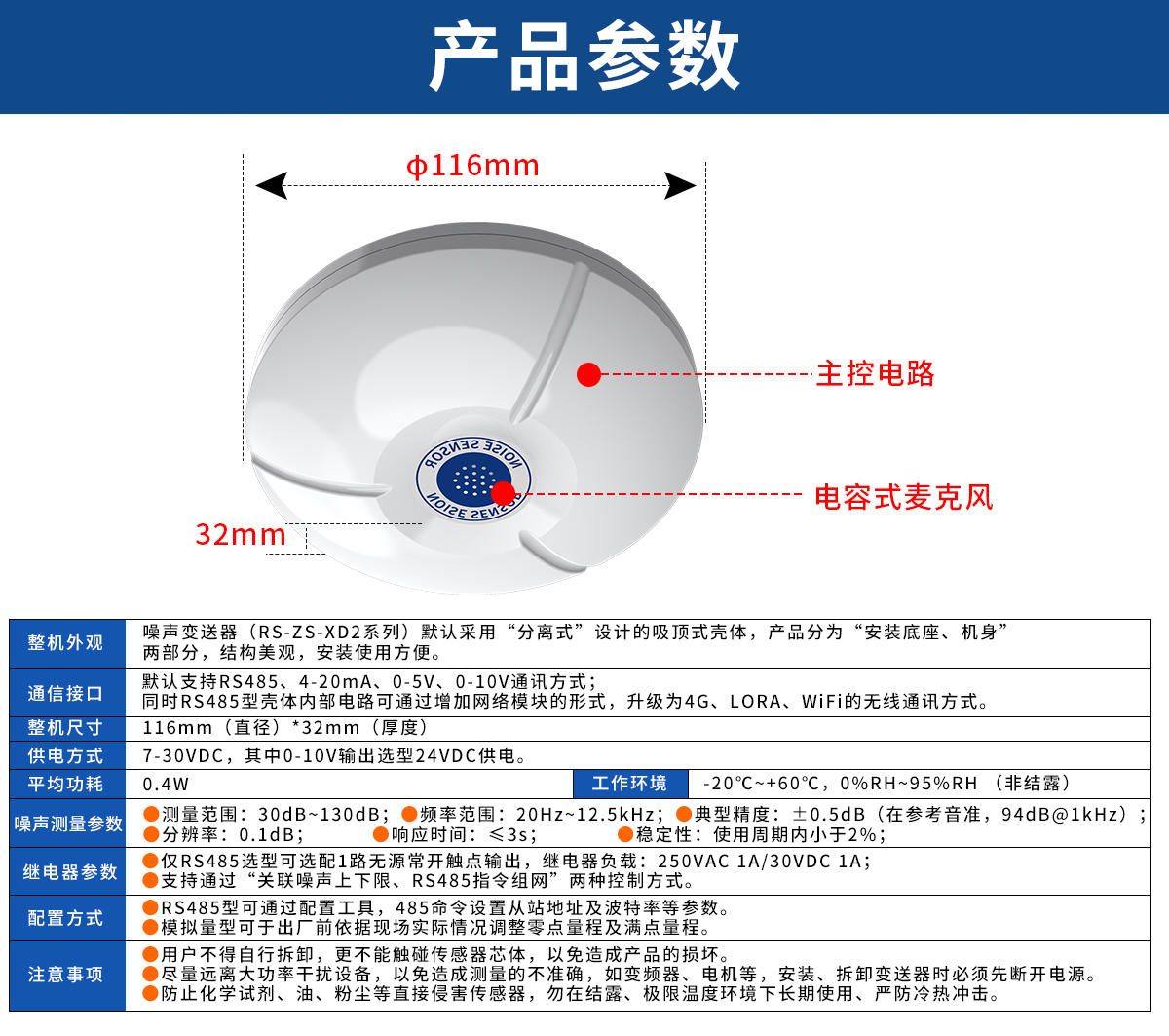 吸頂式噪聲變送器是一款高精度的聲音計(jì)量?jī)x器,采用高靈敏度的電容式麥克風(fēng),量程高達(dá)30dB~130dB,滿足日常測(cè)量需求,支持多種信號(hào)輸出方式,信號(hào)穩(wěn)定,精度高。具有測(cè)量范圍寬、線形度好、安裝方便等特點(diǎn)。廣泛應(yīng)用于家庭、辦公、車間、汽車測(cè)量、工業(yè)測(cè)量等各種領(lǐng)域。