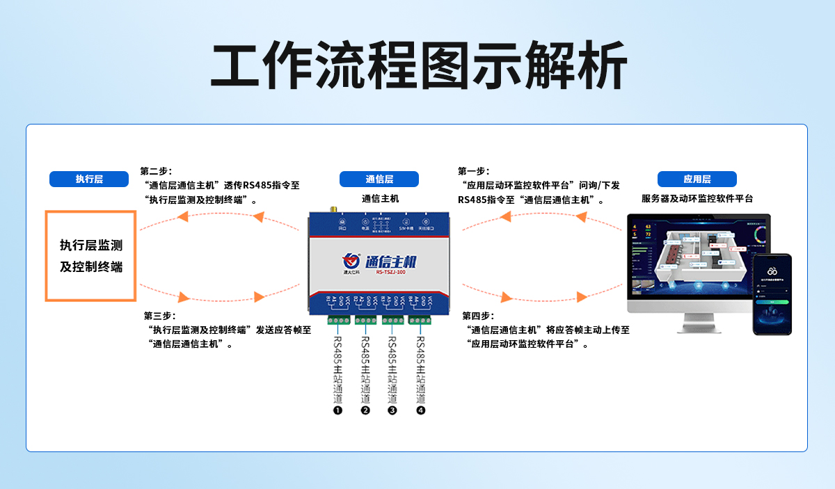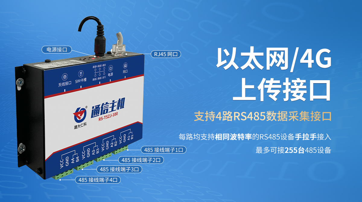 通信主機僅作為動環(huán)監(jiān)測軟件與執(zhí)行層終端之間的通信橋梁,方便動環(huán)監(jiān)測軟件與執(zhí)行層終端之間進行數(shù)據(jù)交互。支持RJ45網(wǎng)口或4G上傳數(shù)據(jù),帶有4 路485 下行接口,每路接口可單獨設(shè)置不同的波特率,最多可接 255 臺 485 設(shè)備。