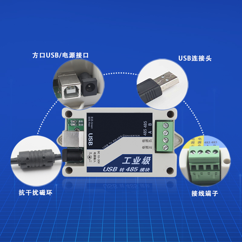 USB轉(zhuǎn)485轉(zhuǎn)換器模塊是一款通過USB擴(kuò)展出一路RS-485接口的工業(yè)級轉(zhuǎn)換器。使RS-485設(shè)備輕易的與具備USB接口的電腦主機(jī)相連。
