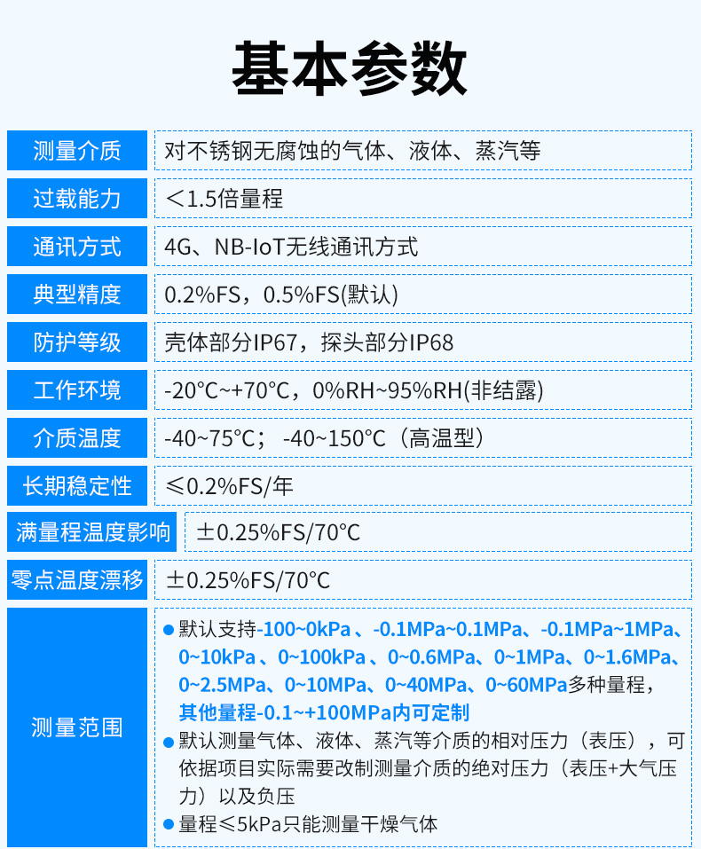 基于4G/NB-loT無線通信的無線壓力變送器由“壓鑄鋁合金外殼、主控系統(tǒng)、液晶顯示屏、測量電路、機(jī)械連接件、擴(kuò)散硅敏感元件”等核心部件組成,支持多種規(guī)格螺紋安裝方式,可適配多種壓力量程,支持150C高溫介質(zhì)測量。默認(rèn)測量“氣體、液體、蒸汽”等介質(zhì)的相對(duì)壓力(表壓),依據(jù)項(xiàng)目實(shí)際需要改制測量介質(zhì)的絕對(duì)壓力(表壓+大氣壓力)以及負(fù)壓。